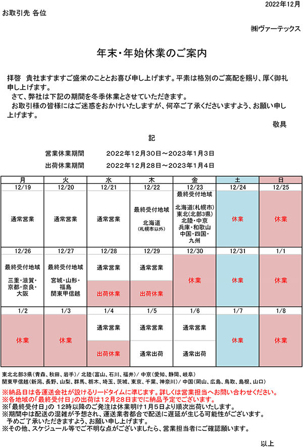 2022年~2023年 年末年始休業のご案内