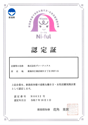 Ni-ful〈ニーフル〉認定制度採択のお知らせ 2025年10月01日 このたび当社は、新潟県が創設した「新潟県多様で柔軟な働き方・女性活躍実践企業認定制度」において、令和7年度の認定企業として認定されました。 今後も、多様で柔軟な働き方の推進や、仕事と家庭の両立支援、女性の活躍推進に積極的に取り組み、誰もがいきいきと働ける職場づくりを目指してまいります。 お知らせ一覧ページへ戻る