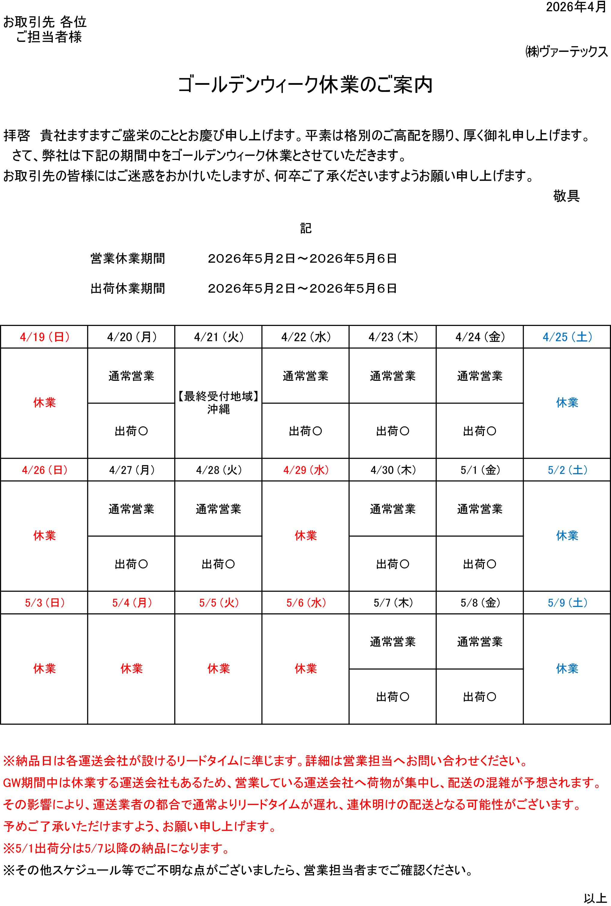 ゴールデンウィーク休業のご案内 2026年04月17日 平素は格別なご愛顧を賜り、誠にありがとうございます。 誠に勝手ながら、2026年5月2日(土)~2026年5月6日(水)までを休業日とさせていただきます。 お客様にはご迷惑をお掛け致しますが、何卒ご了承の程よろしくお願い申し上げます。 お知らせ一覧ページへ戻る